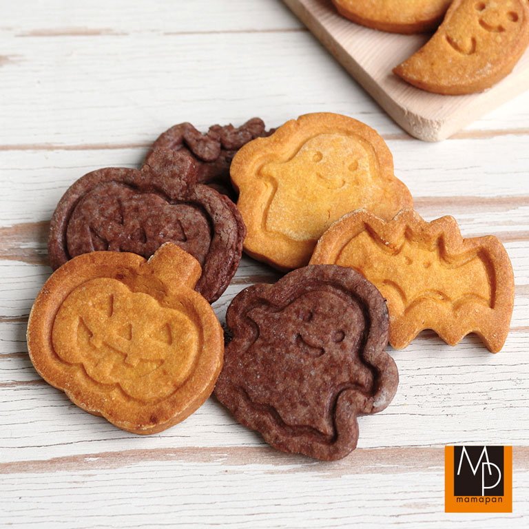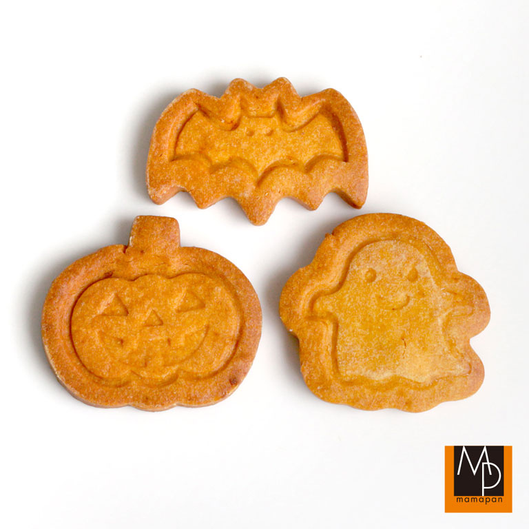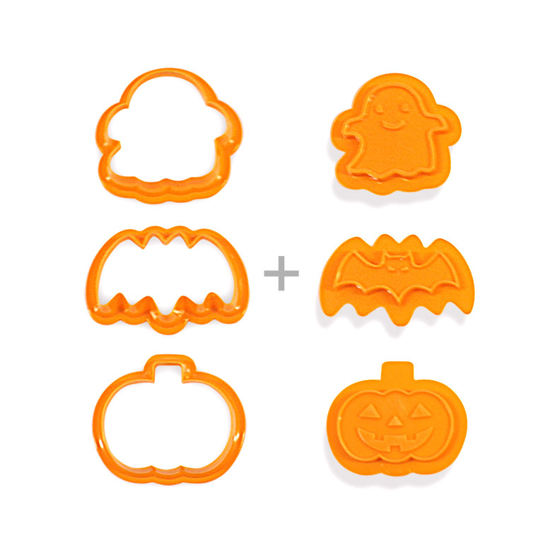 コウモリとカボチャ、おばけの形とくぼみを作るパーツがセットになったクッキー型です。