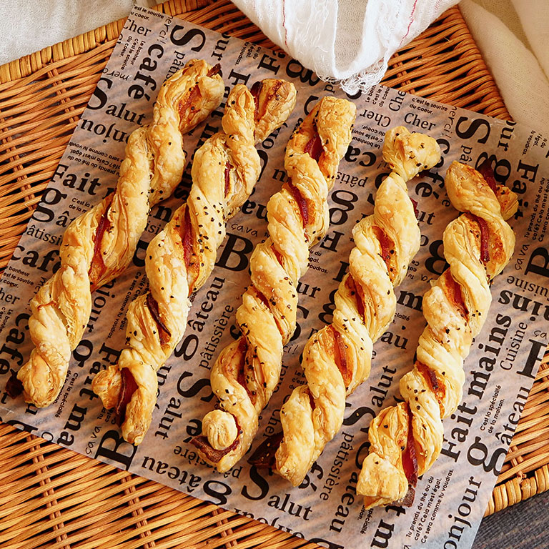 ベーコンの塩味とブラックペッパーのピリッと効いた味わいが、お酒にぴったりなおつまみティックパイです。