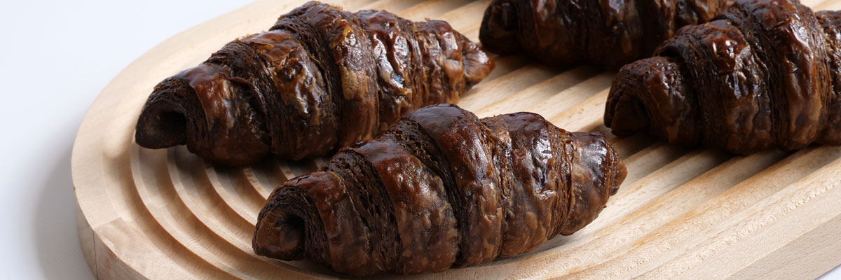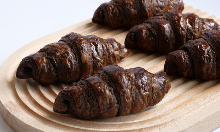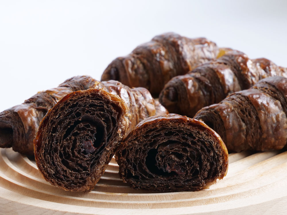 チョコを練り込んだ生地に、発酵バター入りマーガリンを折り込んだクロワッサン生地です。成形の際に、チョコバーを巻き込んだチョコ尽くしのクロワッサンです。