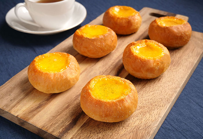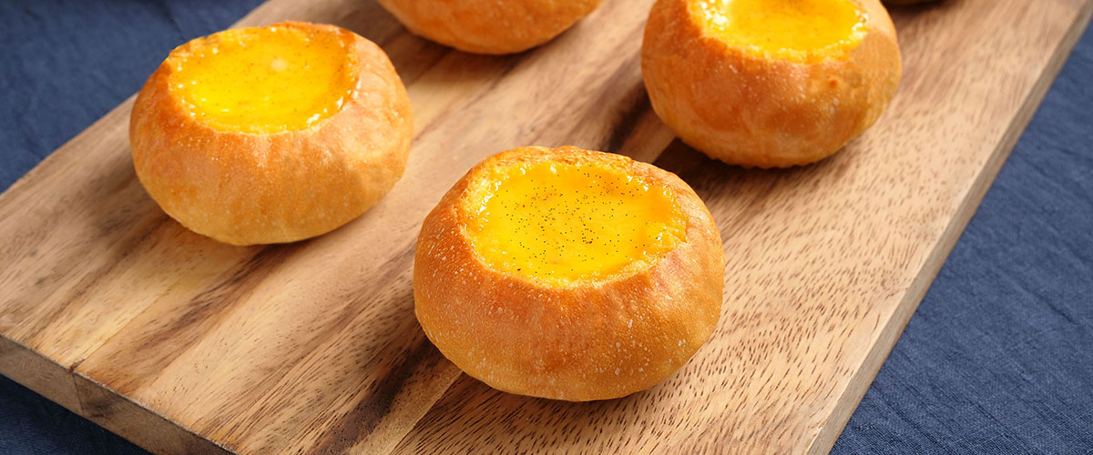くり抜いたプティブールにアパレイユを流し込んで低温焼成した、エッグタルト風のプティ パン ア ラ クレームです。