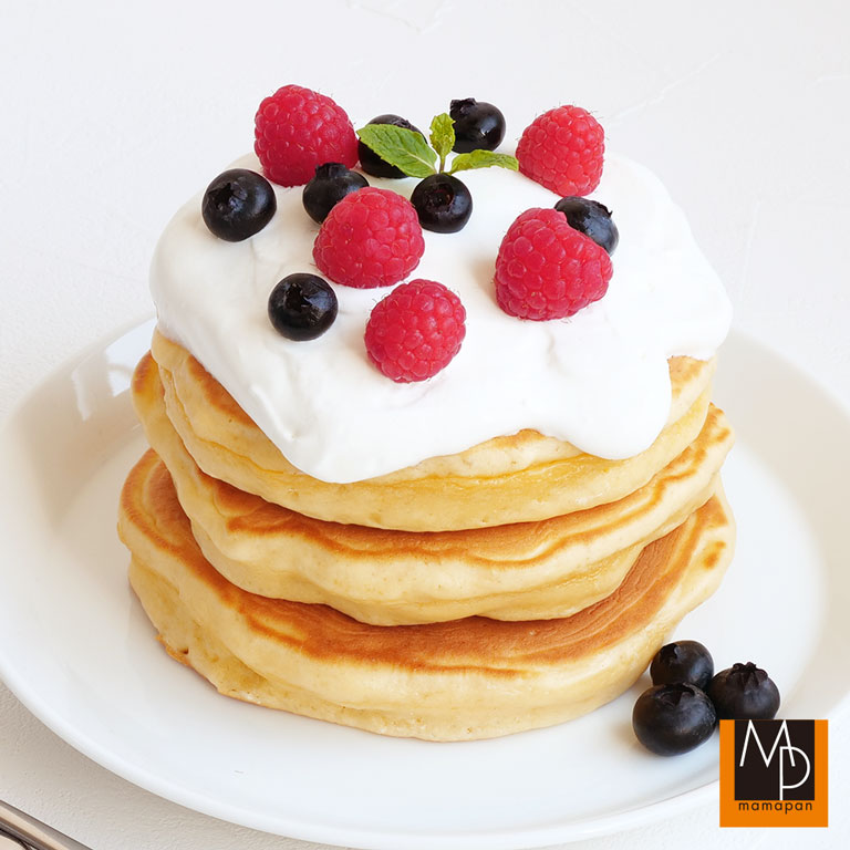 ママパン実店舗で行ったアンケートで、パンケーキで重視することの1位は「おいしさ」、2位は「使用原材料の安全性」でした。その結果をふまえ、味にうるさいママパンスタッフが、限りなく理想に近づけて完成したのがこのパンケーキミックスです。味、香りともにしっかりとしているので、何もつけなくてもおいしくお召し上がりいただけます。チョコペンでお絵描きしたり、生クリームやフルーツでトッピングをし、ケーキのように重ねたりするなど、いろいろとトッピングをお楽しみください。