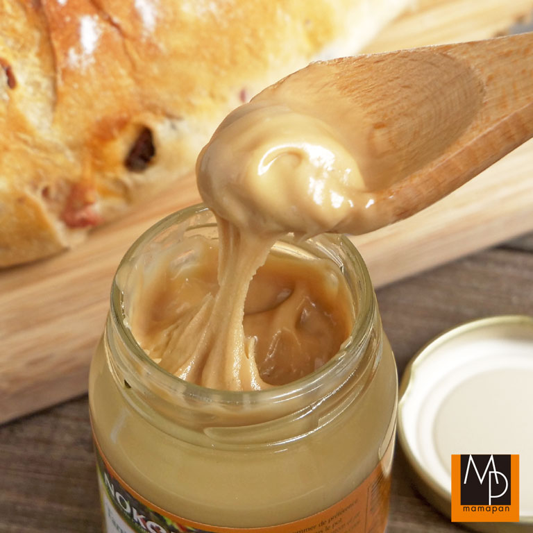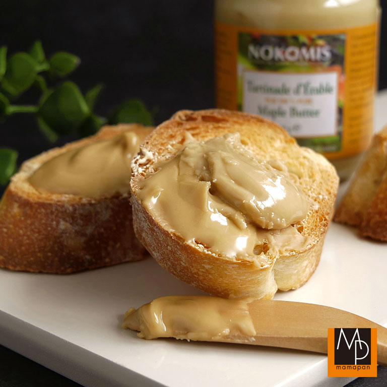100%純粋なメープルシロップを加熱・濃縮し、冷やしながら攪拌し、バターのようにクリーミーでなめらかなスプレッド状にしたものです。