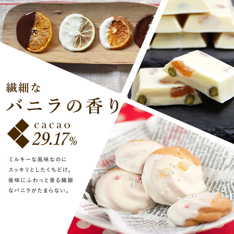 ・チョコレートを作る際に製造ライン上に張り付いて取れなくなることを防止するため、製造ライン上にココアバターが薄く塗られております。そのためチョコレートの平な部分が白くなっている場合がございますが、ココアバターとなりますので問題はございません。