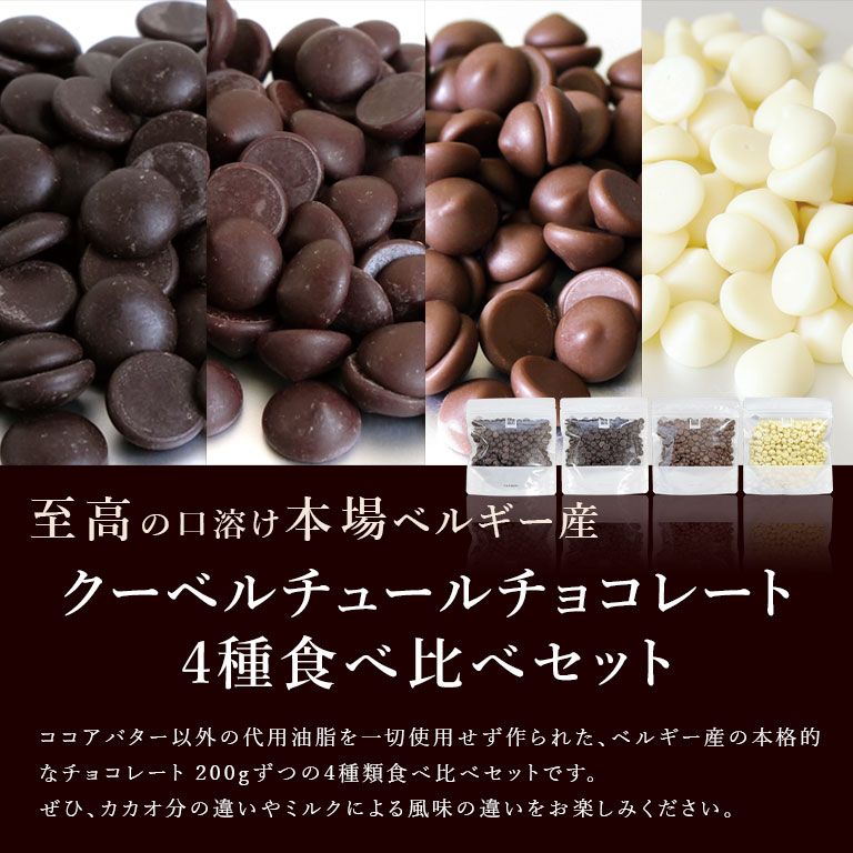 ベルギー産の本格チョコレートを少量ずつお試しいただける送料無料のお得なセットです。ビターが2種類入っているので、カカオの量で変わる風味の違い、ミルク入りとの違いなど、それぞれの特徴を感じていただけます。ぜひ食べ比べて、お好みのチョコレートを見つけてください。