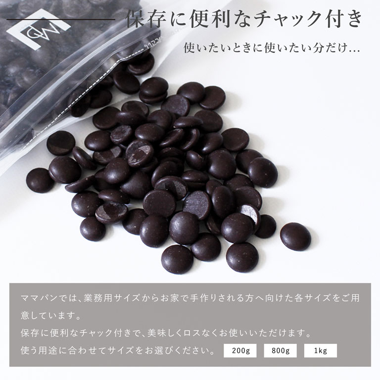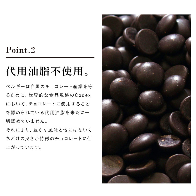 ベルギー産のダークチョコレートです。豊かなカカオの風味と滑らかな口溶け、はっきりとしたほろ苦さと甘さは、お菓子やパン作りにお使いいただくのはもちろん、ついついそのまま食べてしまう美味しさです。