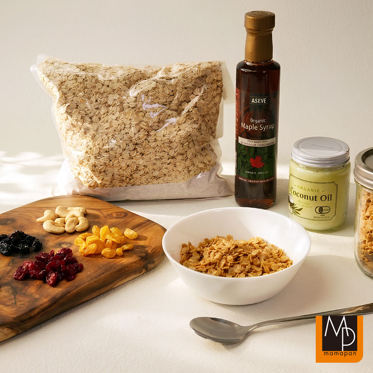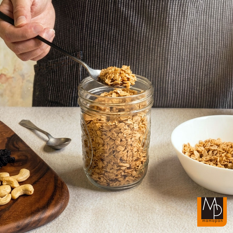 手作りグラノーラは保存料を使用していないため、湿気や酸化を防ぐことが大切です。密閉容器に入れ、冷暗所で常温保存してください。