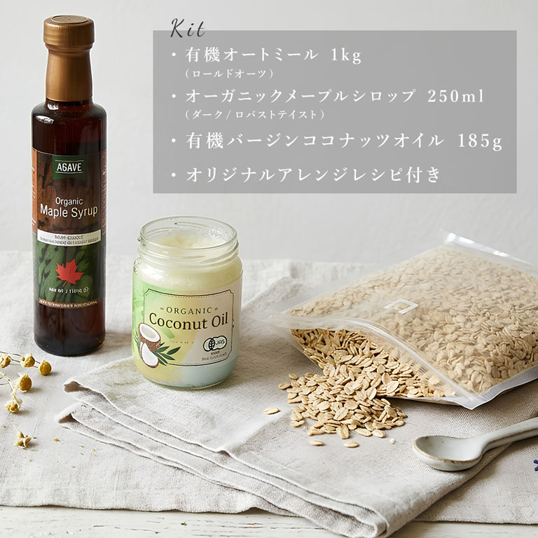 オーガニック素材だけでつくる、やさしい味わいの手づくりグラノーラキット。毎日続けたくなる手軽さと美味しさが魅力です。ナッツやフルーツをトッピングすれば、さらに楽しみ方が広がります。