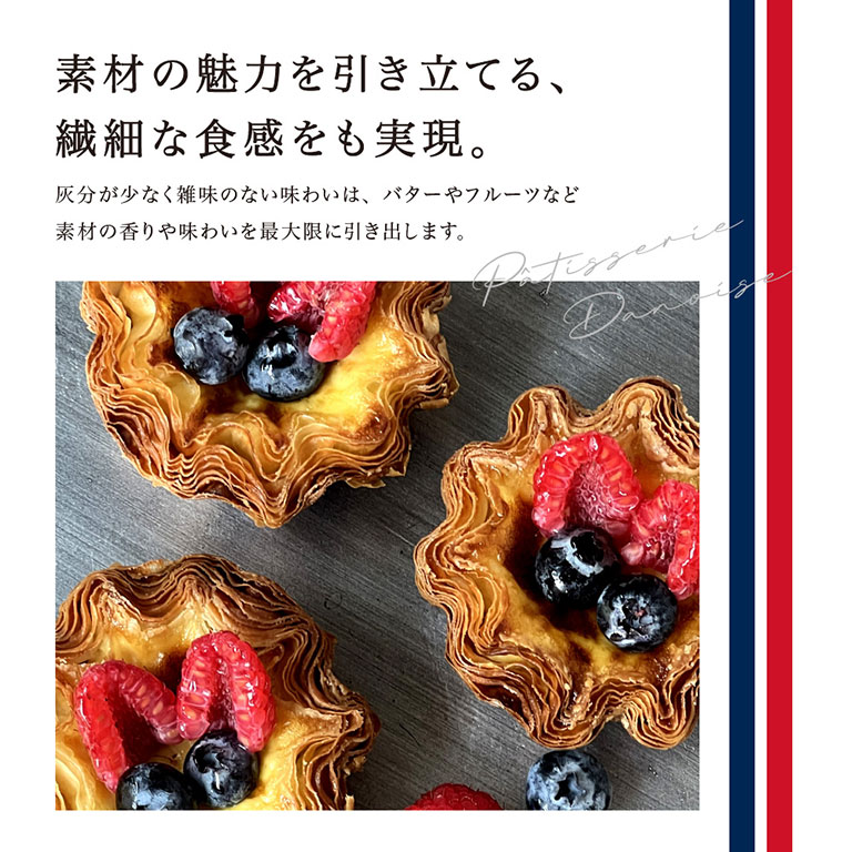 雑味が少ないので、バターの香りやフルーツの味わいを引き立てることができます。繊細な仕上がりを求める際には、是非お使いいただきたい小麦粉です。