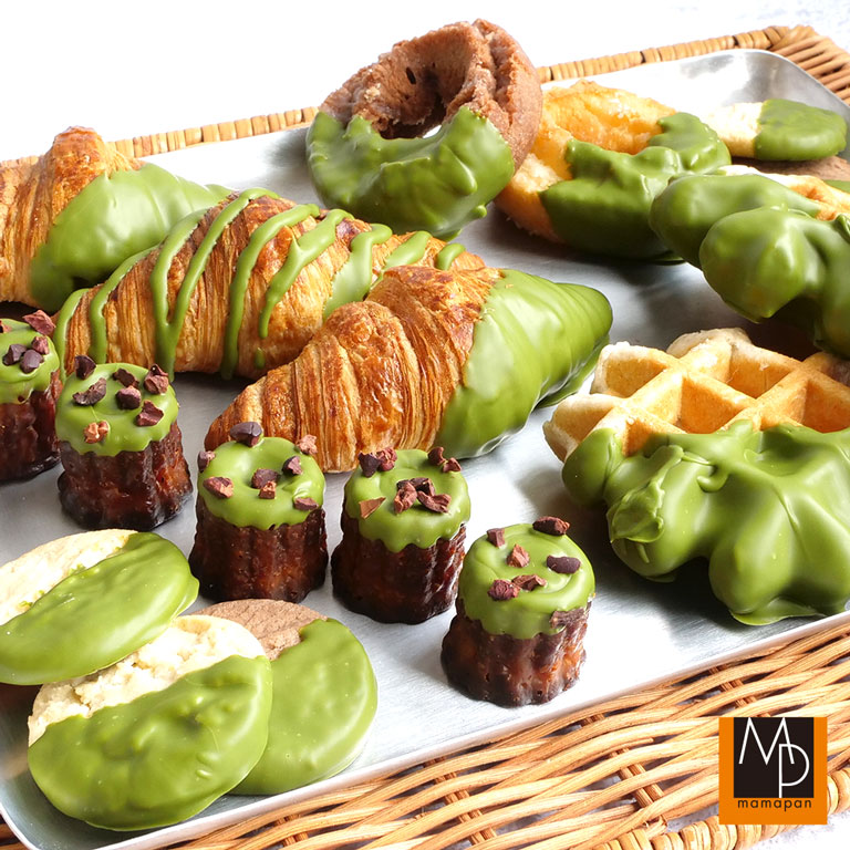 抹茶の鮮やかで美しい緑色と、ふくよかでほんのり苦みのある風味が楽しめるコーティング用のチョコレートです。エクレアやクッキー、デニッシュ、ドーナッツなど、様々なパンやお菓子を華やかに仕上げていただけます。
