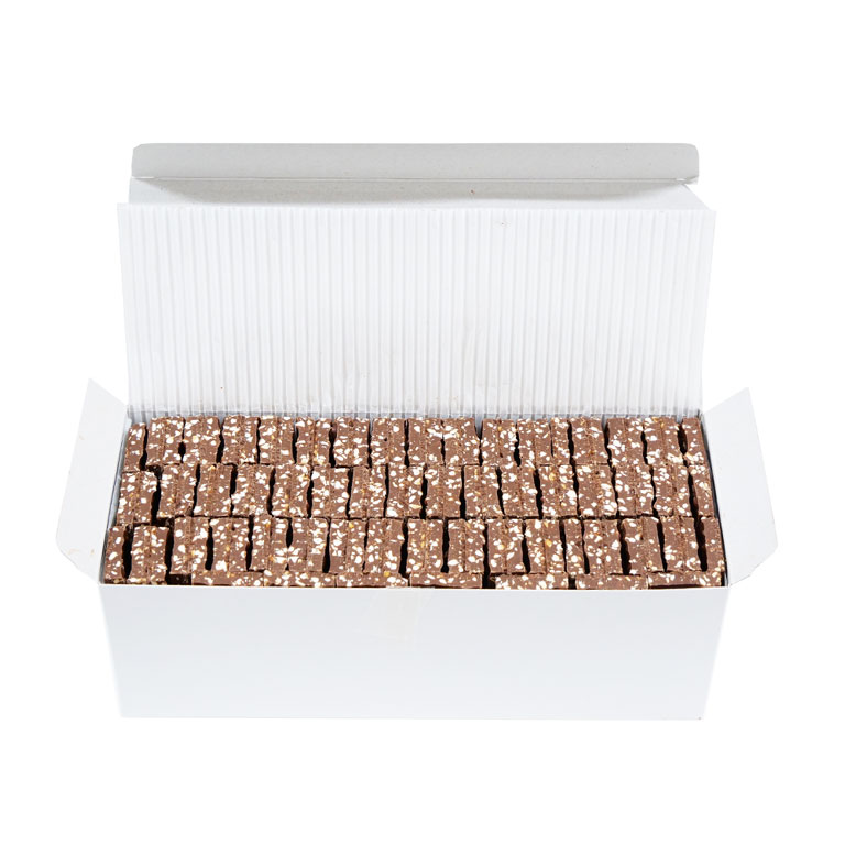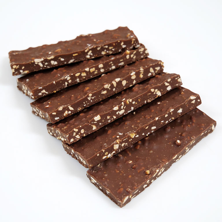 ヘーゼルナッツの粒を練り込んだ香ばしい味わいのプレート状のチョコプレートです。
