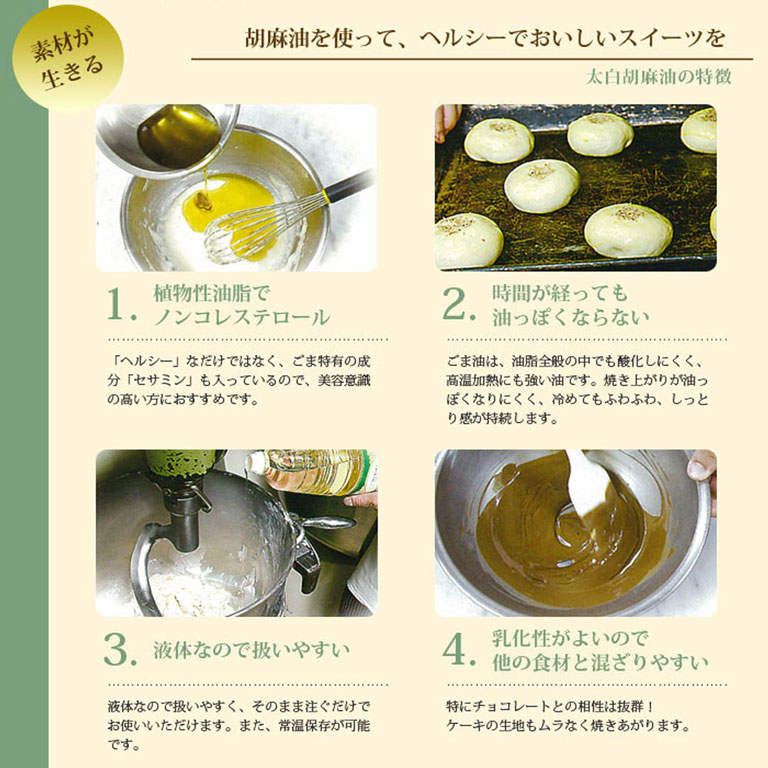 上質な風味と素材の良さを引き立てる太白胡麻油は、スイーツの食感や味わいを豊かに仕上げます。