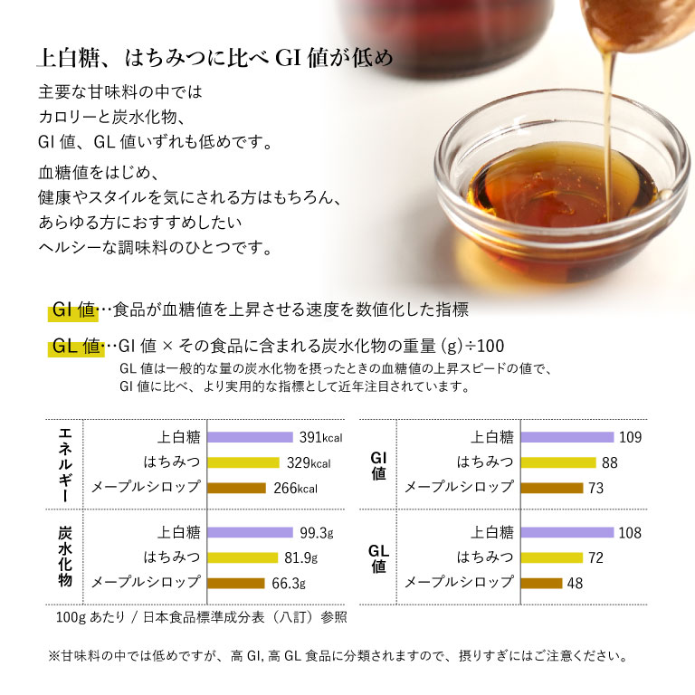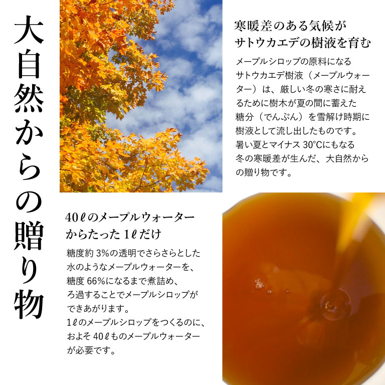 100%ピュアなメープルならではの、やさしい甘さとコクのある風味をお楽しみいただけます。