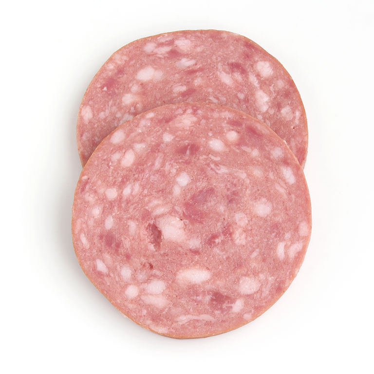 ボロニアソーセージとは、イタリアのボローニャで生まれた肉や脂身などを牛の腸に詰めた丸い大型のソーセージです。