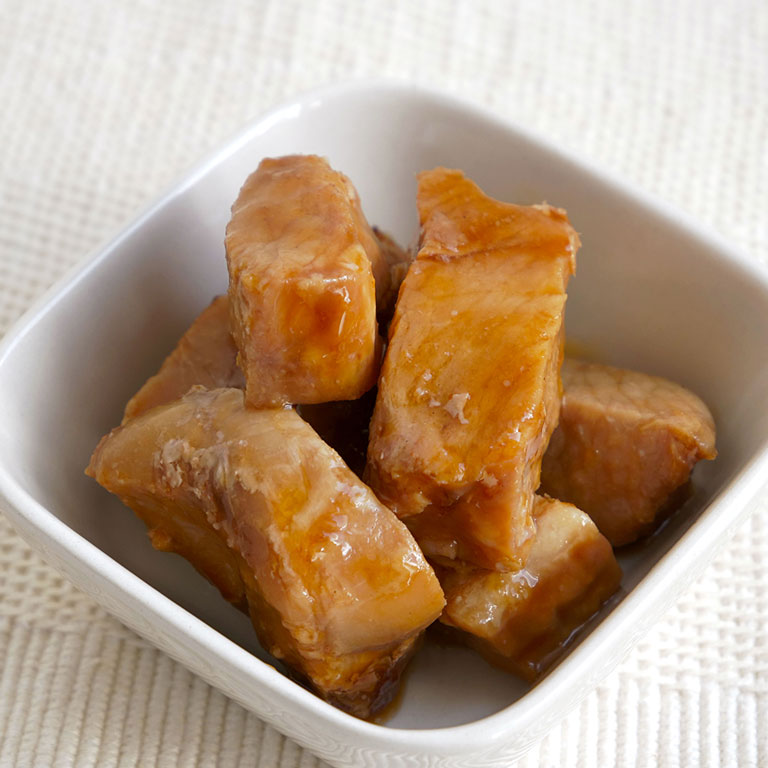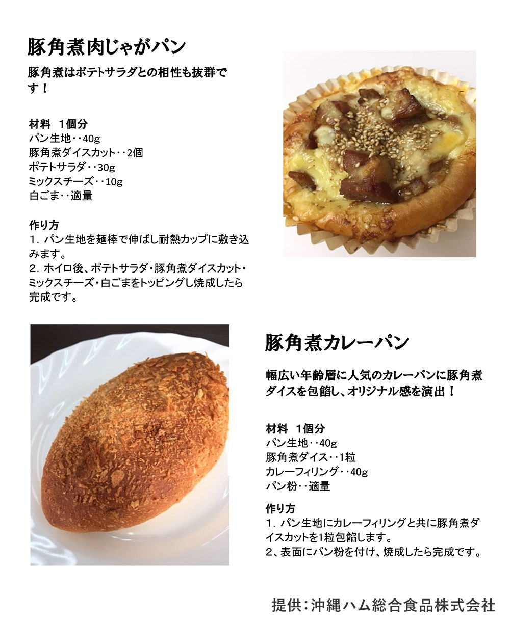 沖縄料理の豚角煮を食べ応えのあるごろっとしたダイス状にカットした冷凍惣菜です。総菜パンに使用するとハッキリとした味わいと具材感を楽しめるパンに仕上がります。また、コッペパンやバゲットに挟んでボリュームたっぷりのホットドッグやサンドにするのもオススメです。