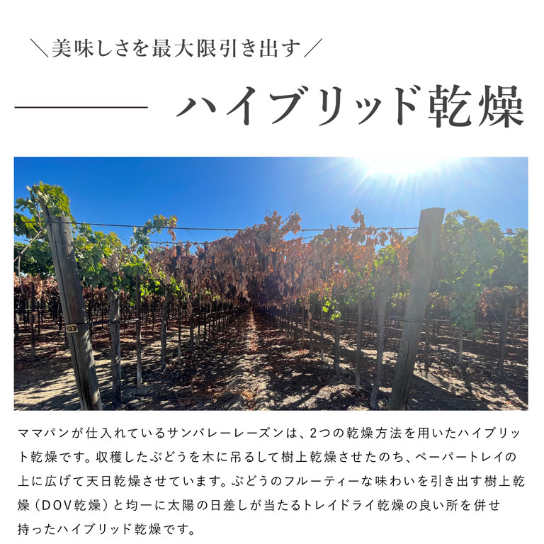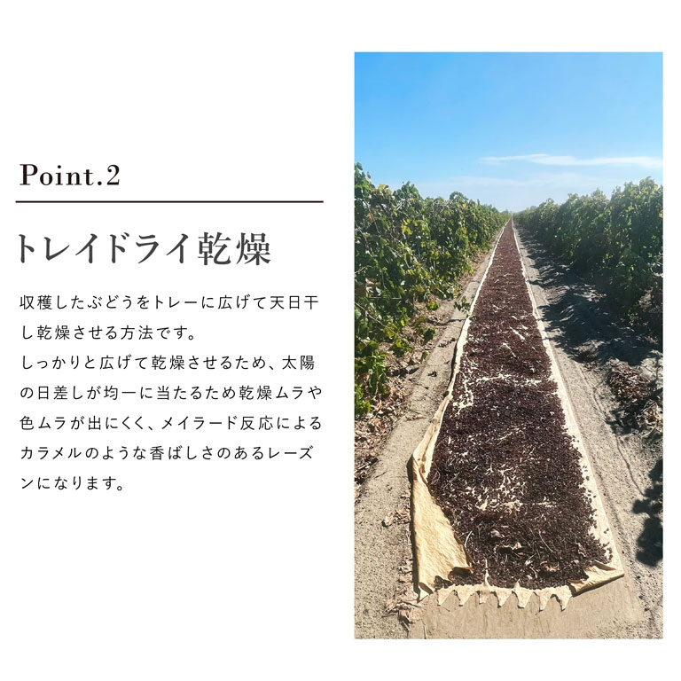 収穫したぶどうを木に吊るして樹上乾燥させたのち、ペーパートレイの上に広げて天日乾燥させています。ぶどうのフルーティーな味わいを引き出す樹上乾燥(DOV乾燥)と均一に太陽の日差しが当たるトレイドライ乾燥の良い所を併せ持ったハイブリッド乾燥です。