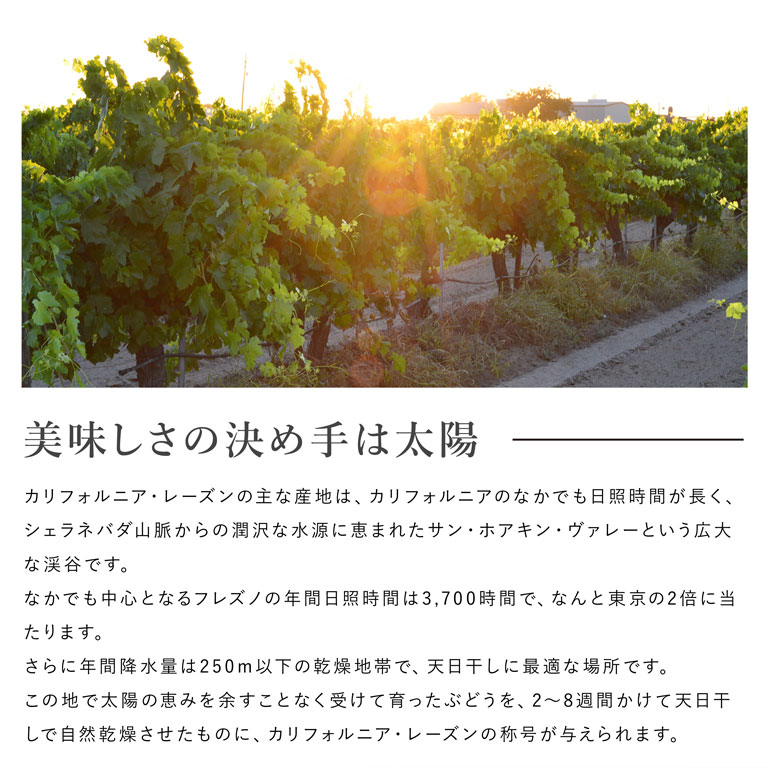 カリフォルニアの眩い日差しをたっぷりと受けたノンオイルコートのレーズンです。ぶどう本来の瑞々しさと、カリフォルニアレーズンの特徴である濃厚なカラメル風味を有しており、小腹が空いた時のスナックや、パン菓子材料として幅広くお楽しみいただけます。