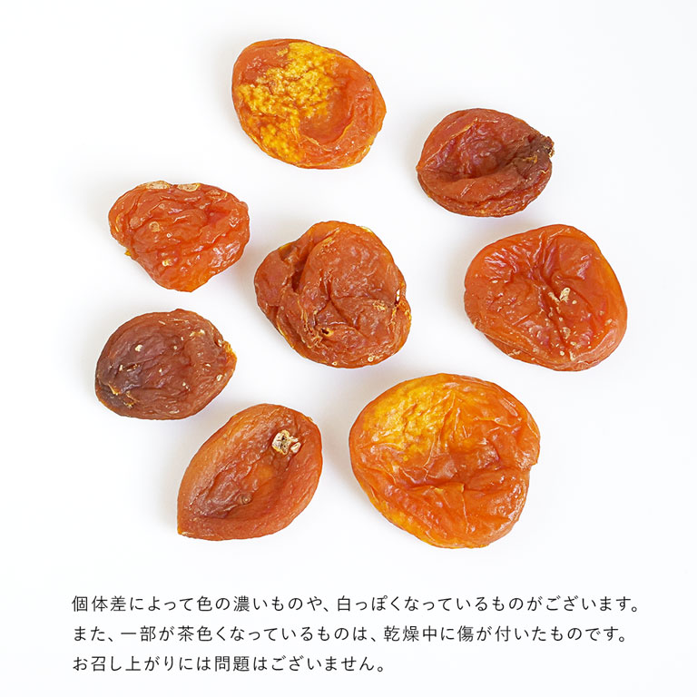 また、表面の一部が茶色くなっているものは乾燥中にアプリコットに傷が付いたのもです。お召し上がりいただいても問題はございません。