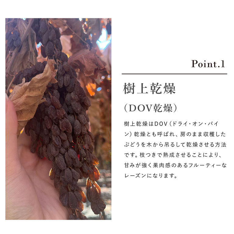 樹上乾燥はDOV(ドライ・オン・バイン)乾燥とも呼ばれ、房のまま収穫したぶどうを木から吊るして乾燥させる方法です。枝つきで熟成させることにより、甘みが強く果肉感のあるフルーティーなレーズンになります。