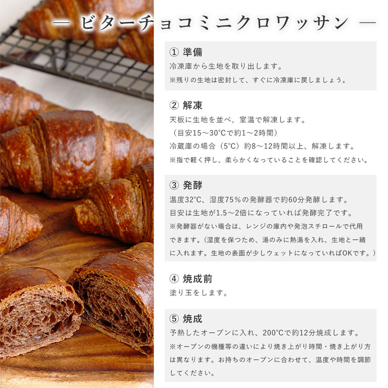 カカオの香りとビターな味わいが美味しいビターチョコのミニクロです。サクサクの焼きたてが美味しいのはもちろん、チョコがけしたりホイップでデコレーションしたりのアレンジも絶品です。ミニサイズなのでお子様のおやつやブランチにもオススメです。