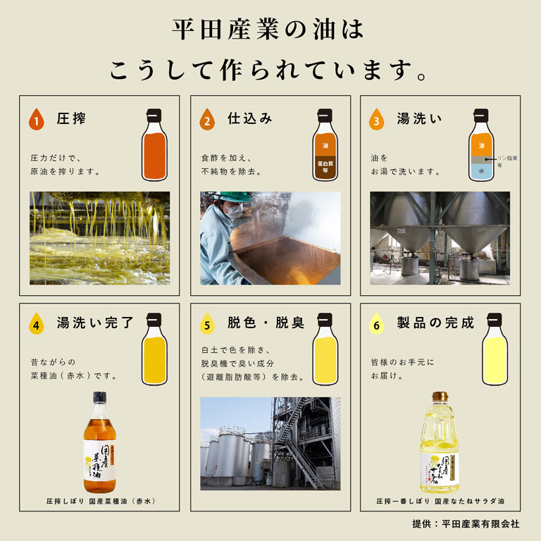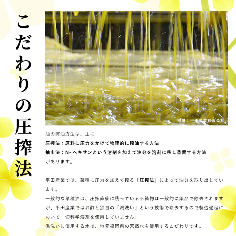 溶剤による抽出を行わず、菜種に圧力を加えて絞る「圧搾法」にこだわって搾油し、お酢と自然豊かな福岡県朝倉市の水で不純物を洗い流す独特の方法を採用しています。