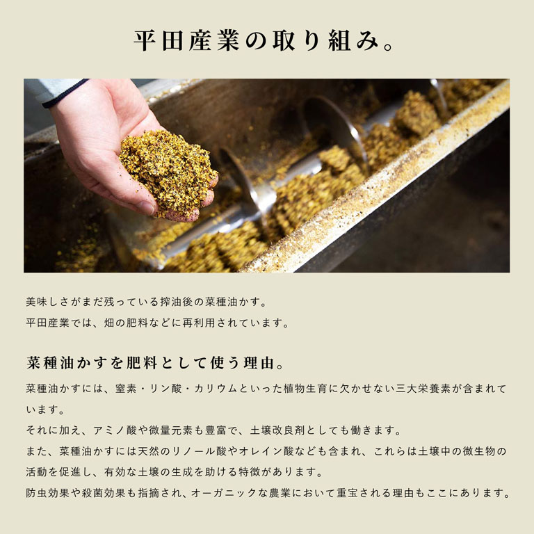 菜種の産地である福岡県三井郡で明治35年に創業し、「安心して口にできるものを作る」という強い思いを持って菜種油を作り続ける老舗企業です。