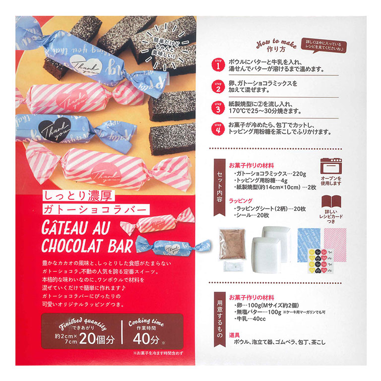 材料を混ぜて焼成するだけのワンボウルで出来上がる手軽さが魅力の手作りキットです。一度にたくさん作れる材料や型・ラッピングなどがセットされて、分かりやすいレシピカードが付いているので、友チョコやホームパーティなどたくさん必要な方にオススメです。