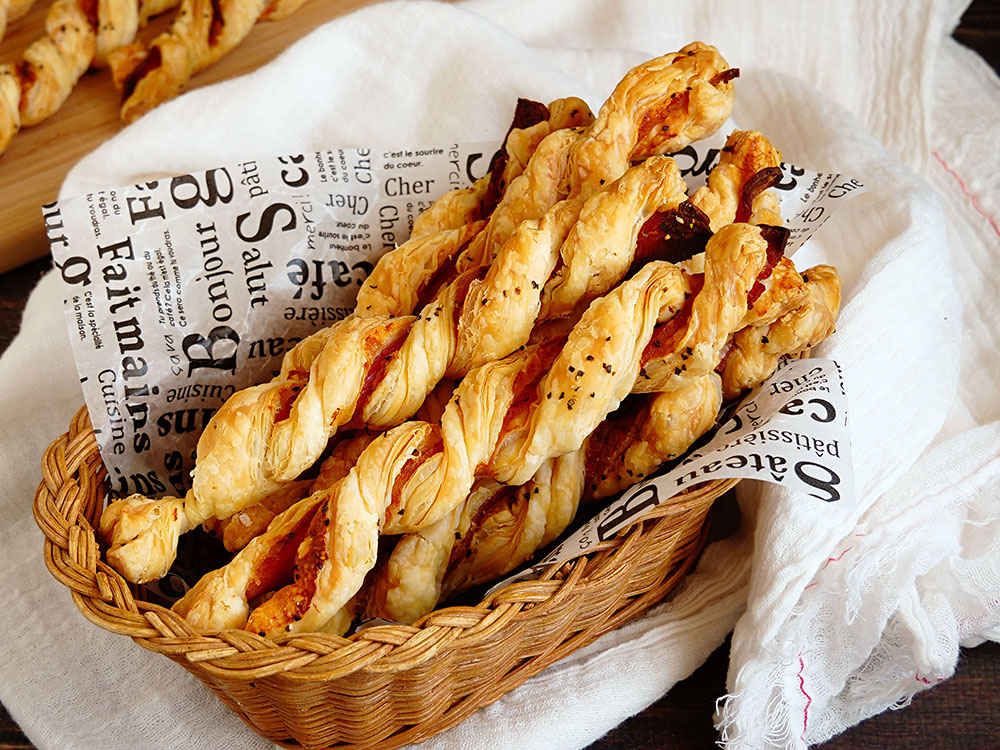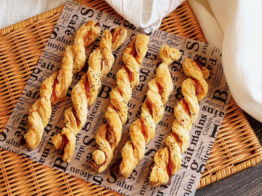 ベーコンの塩味とブラックペッパーのピリッと効いた味わいが、お酒にぴったりなおつまみティックパイです。