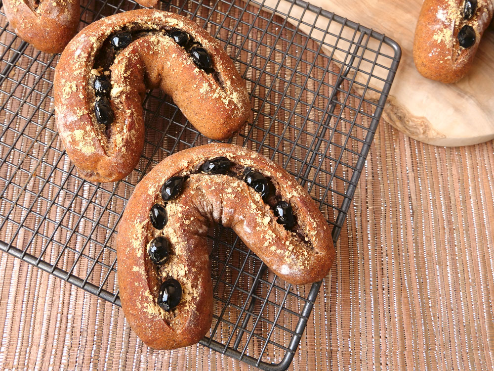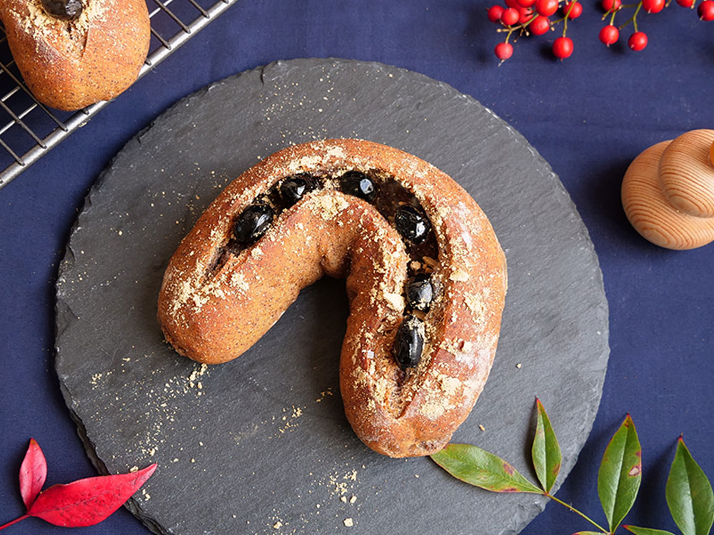 きな粉は、良質な植物性たんぱく質と食物繊維、イソフラボン、ミネラルなどを豊富に含む日本の誇るスーパーフードです。そんなきな粉とふっくら炊いた黒豆を生地にも具材にもふんだんに使用し、午年を意識した馬蹄型に焼き上げた、ヘルシーでおめでたいパンです!具材にクリームチーズを使っているので、香ばしいきな粉や黒豆とミックスされ、優しくさっぱりした甘さに仕上がります。