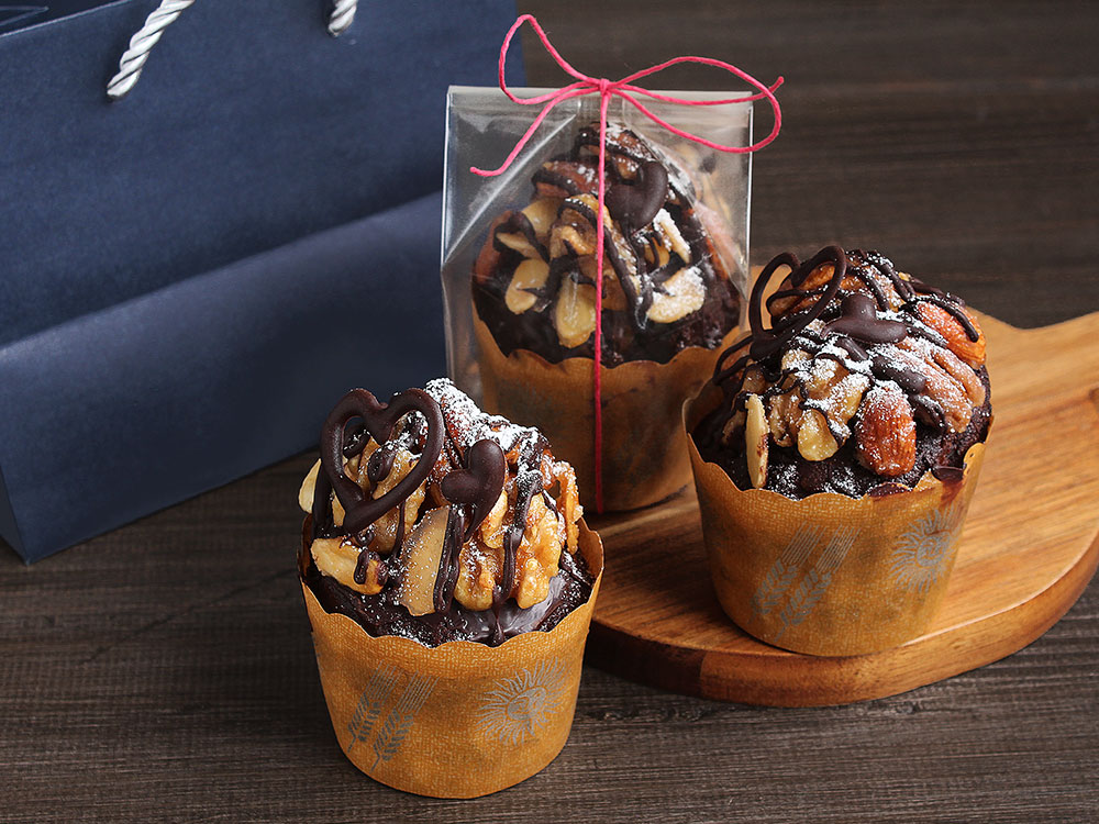 プレーン生地にココアとチョコチップをプラスして、キャラメリゼしたナッツを贅沢にトッピング。